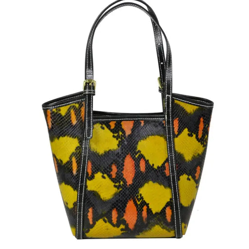 About this product This is a stylish small handbag with a colorful, snake-patterned design. It features a combination of yellow and black colors. ...