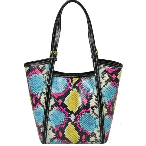 About this product This is a stylish small handbag with a colorful, snake-patterned design. It features a combination of blue , pink , yellow and ...