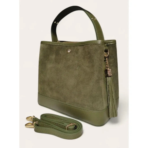 About this product GIT19O Italian Olive Suede & Leather Bag Made in Italy 100% Leather Size: 9.8" x 5.5" x 9" Zip Closure