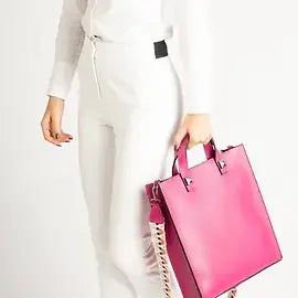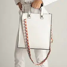About this product This a vibrant white leather handbag featuring a structured design and dual top handles. It has a distinctive flap closure with...