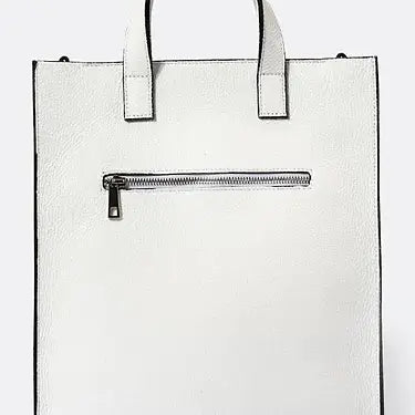 About this product Nathalie Leather Tote Bag with Fabric Strap Made in Italy Zip Closure and zip closure in the back Size: 11.8"W x 13.3"H x 2.3"D