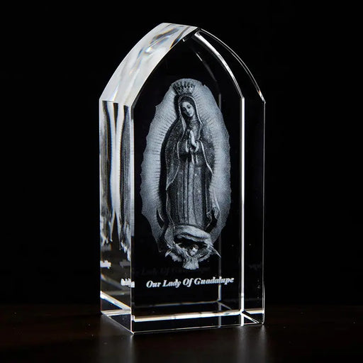 About this product: This Etched Glass Stand from Jeweled Cross features a 3D image of Our Lady of Guadalupe in the center. The crystal clear look ...