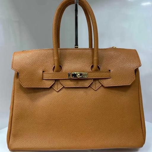 About this product This a vibrant camel leather handbag featuring a structured design and dual top handles. It has a distinctive flap closure with...