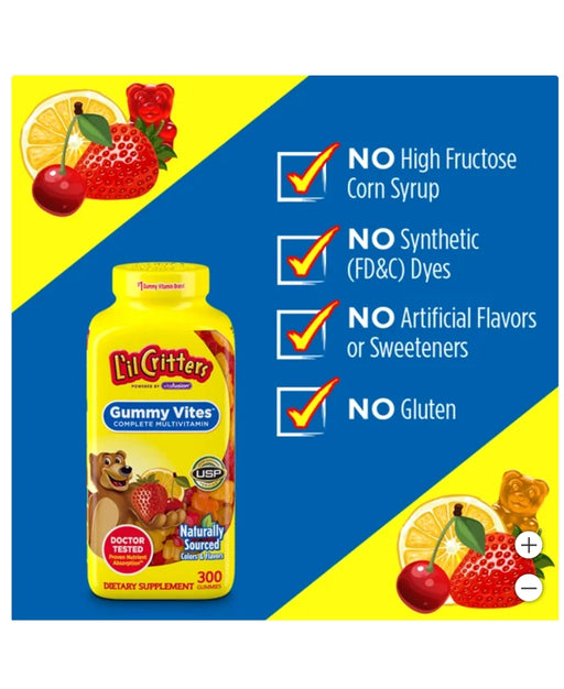 Features: Provides Over 10 Essential Vitamins and Minerals Orange, Cherry & Green Apple Flavors Two Bottles, 160 Gummies Each USP Verified*