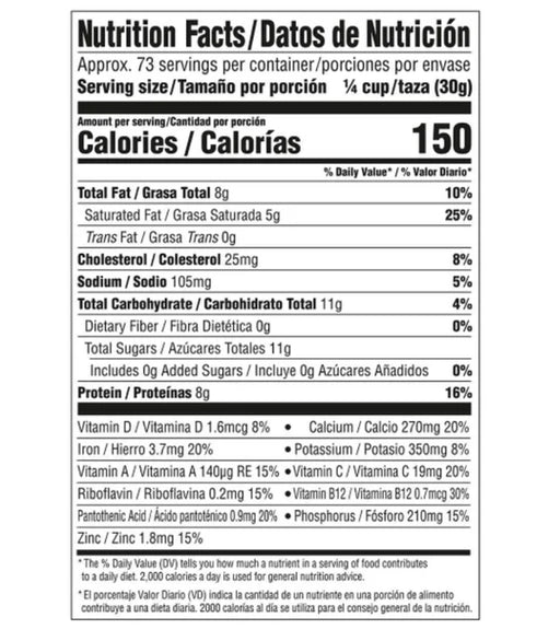 Features: Dry Whole Milk Powdered Drink Mix 9 Vitamins & Minerals 73 Servings Total Net Weight: 4.85 lbs